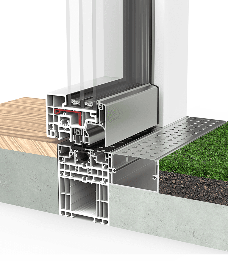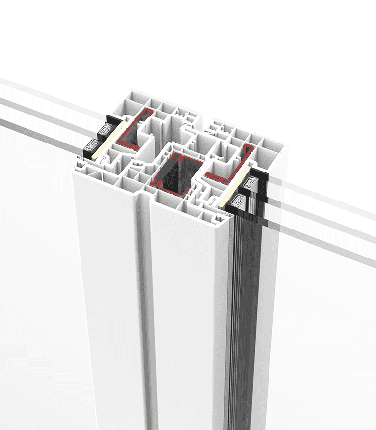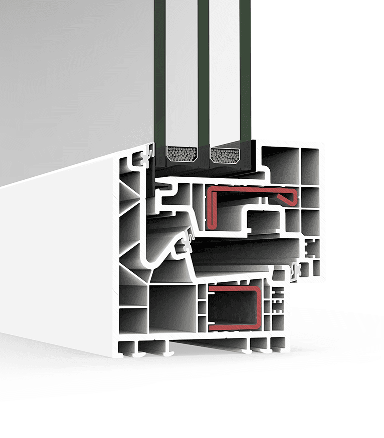 Sistema batente de 84 mm de profundidade e perfis de 6 câmaras interiores com espumas isolantes inseridas no aro e na folha que lhe permitem alcançar as melhores prestações térmicas do mercado.