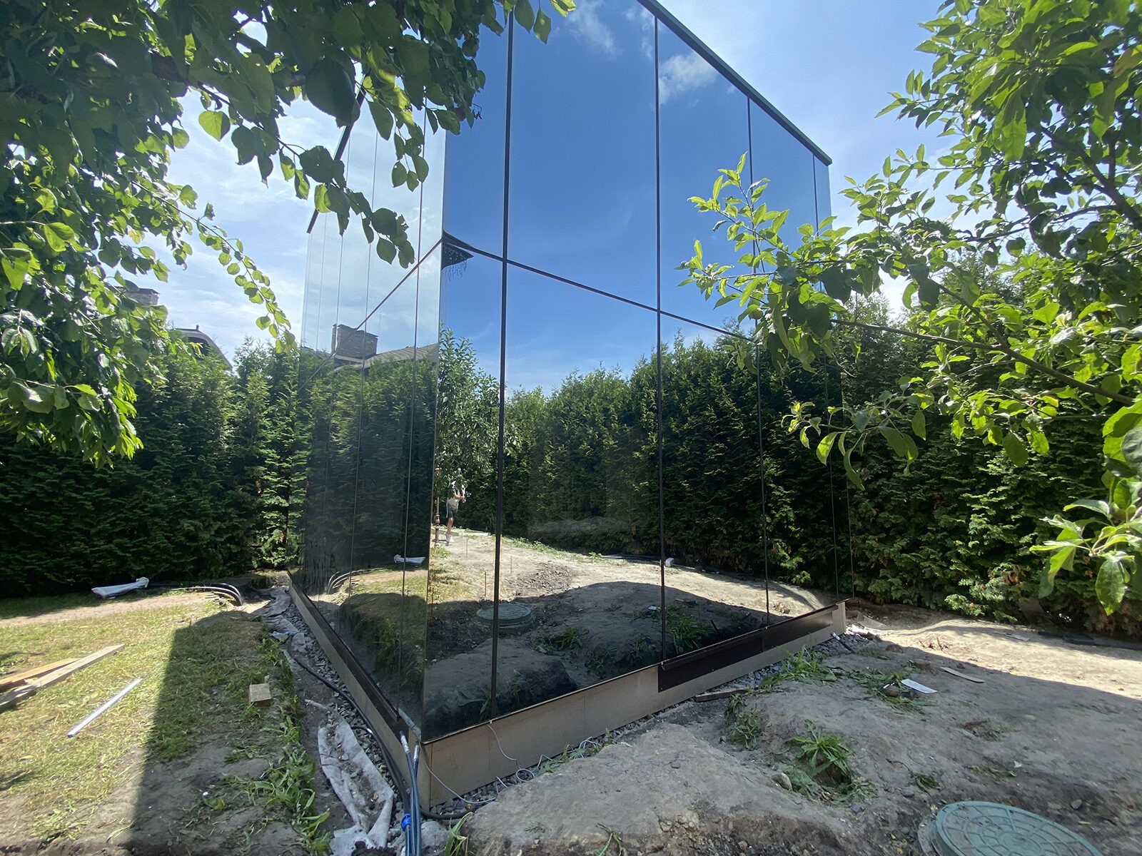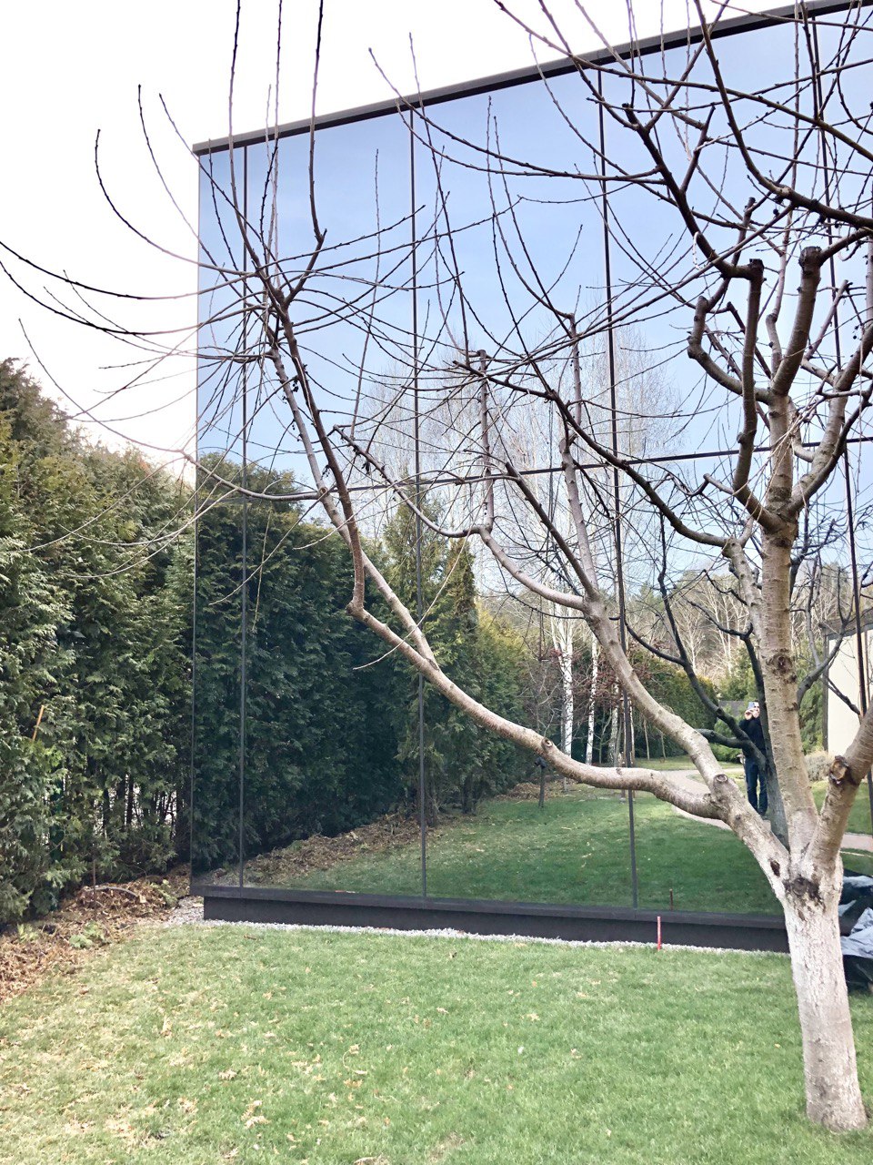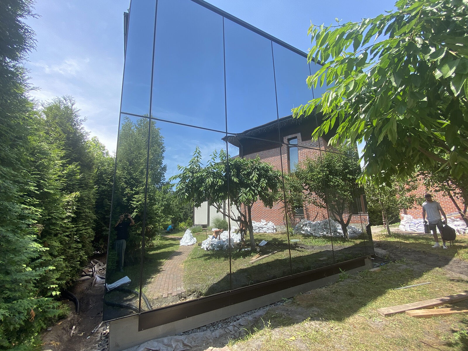 Realizar o trabalho de arranjo da fachada da casa, escondendo-a o mais possível no exterior do terreno, com recurso a vidros dulplos espelhados.