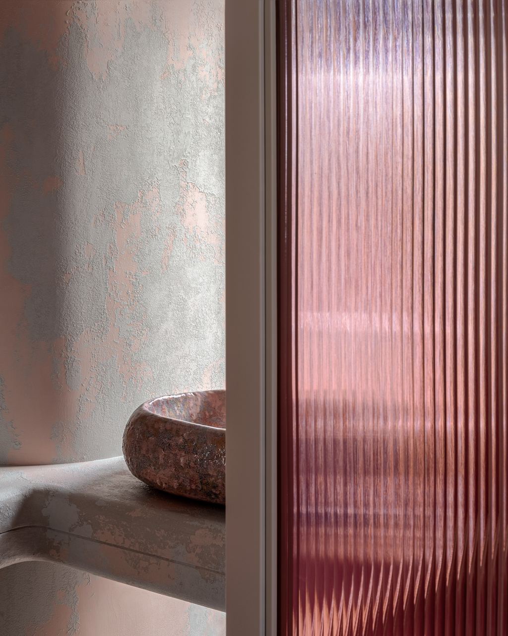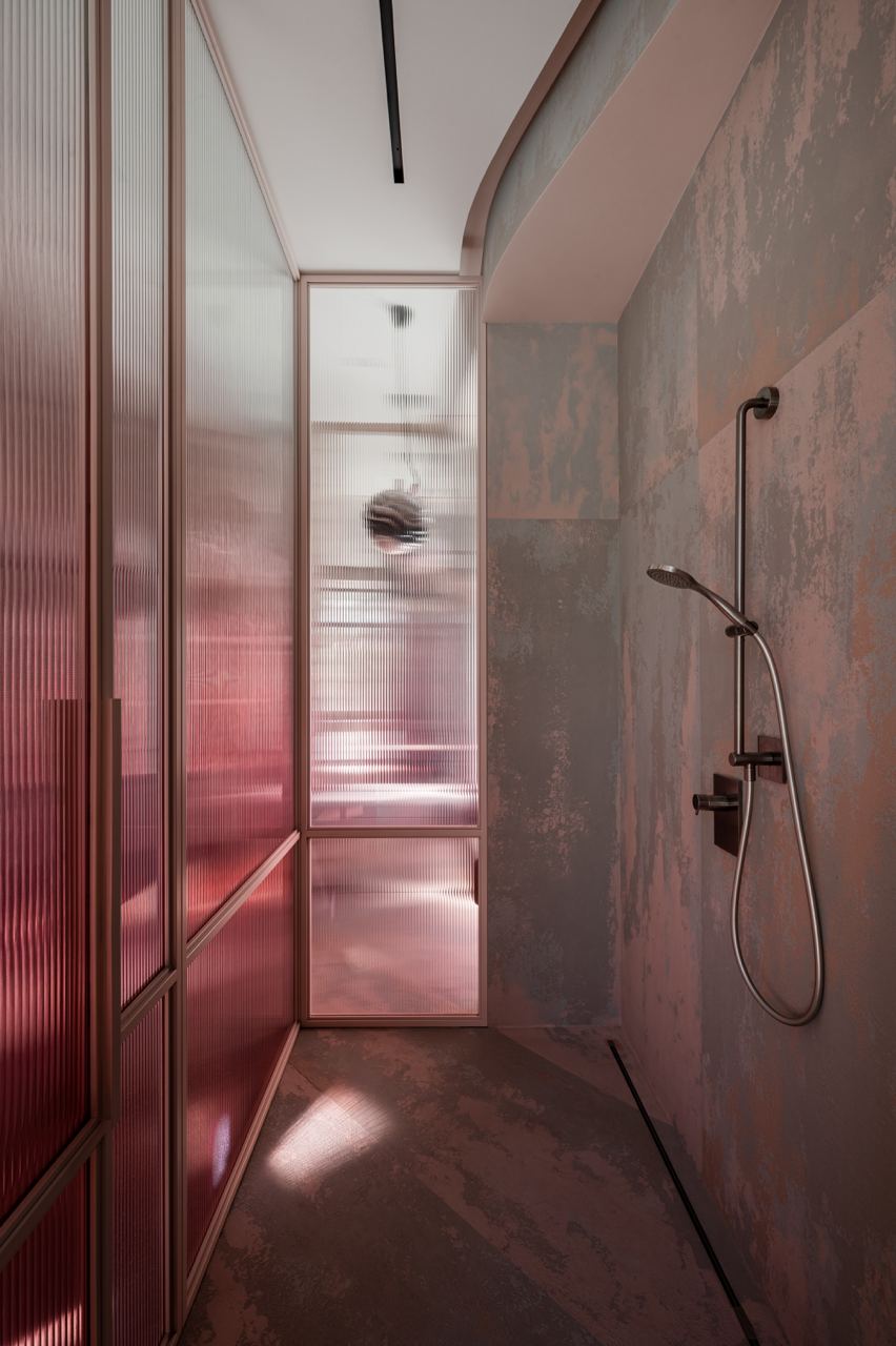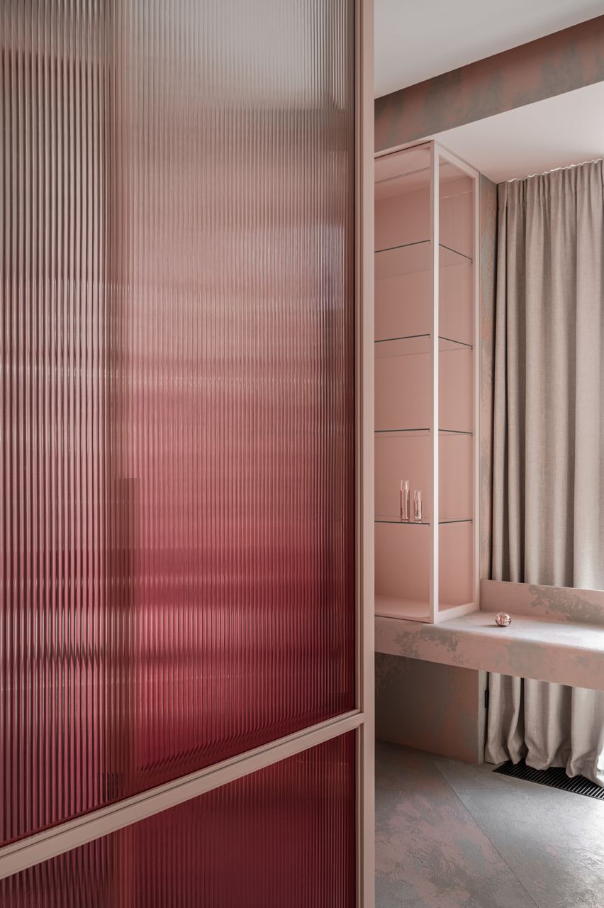 O vidro canelado triplex com um gradiente de cor confere elegância e sofisticação.